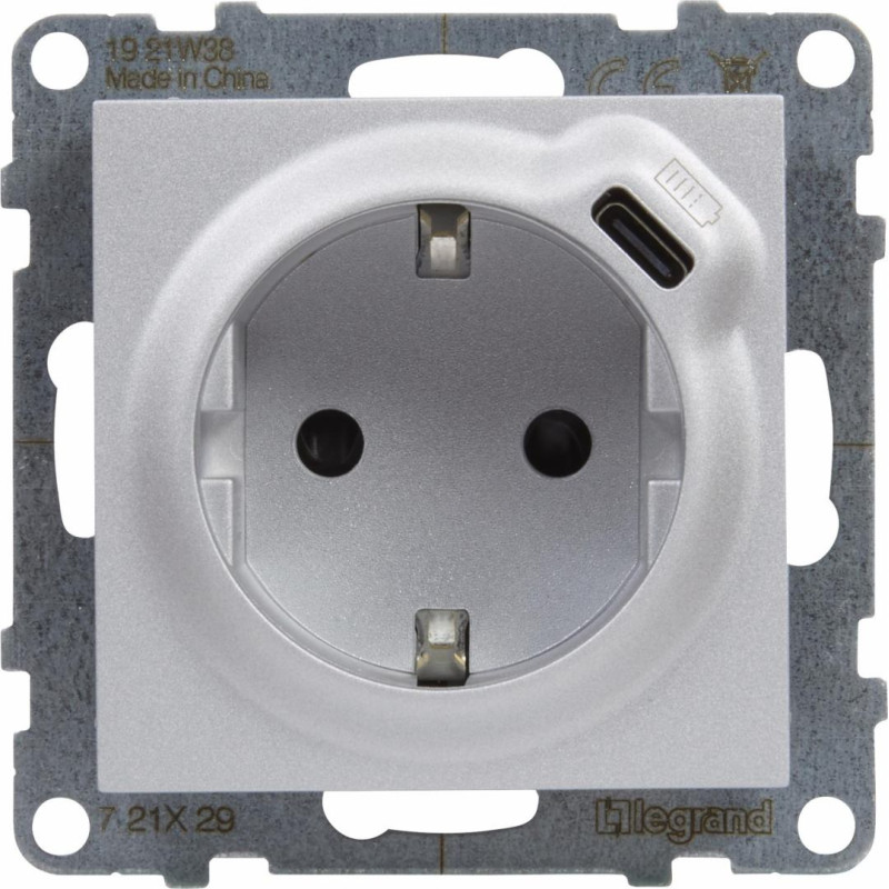 SUNO alumīnija Rozete, 2P+E ar bērnu aizsardzību + USB Type C